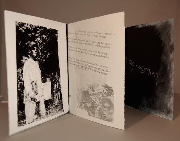 | Free - women is an accordian book combining digital photos and lithographic prints with a text from the Dred Scott decision. Total size is 15 x 37 1/4" |