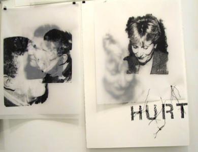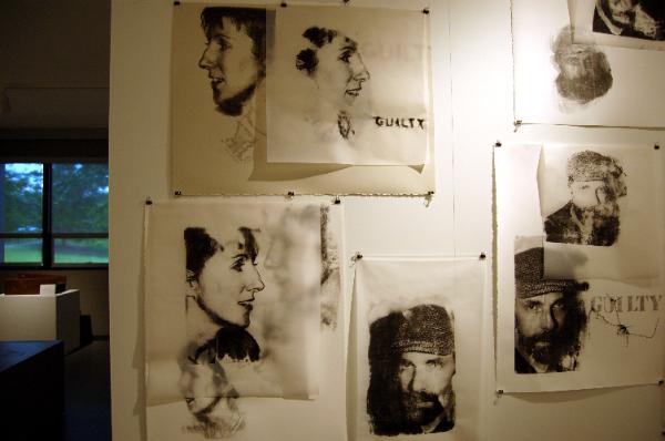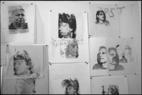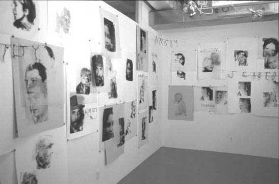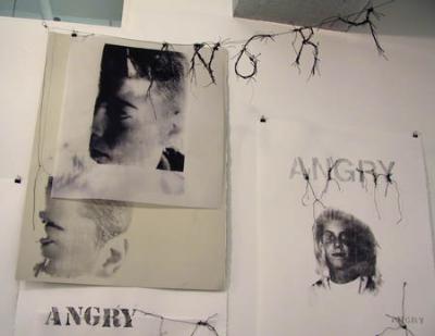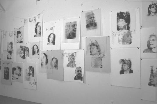 | This installation was at the Ceres Project Room, New York City, in June, 2002. The 17' x 12' room was filled with images of individuals and words formed from knotted and glued black thread: Angry, Scared, Lost, Hurt, Guilty -- the emotional aftereffects of 9/11. This work has been reconfigured to fit into a space at the Freyberger Gallery at Penn State Berks as part of the exhibition, 'Crisis and Reaction" that opened Sept. 11, 2011. |
