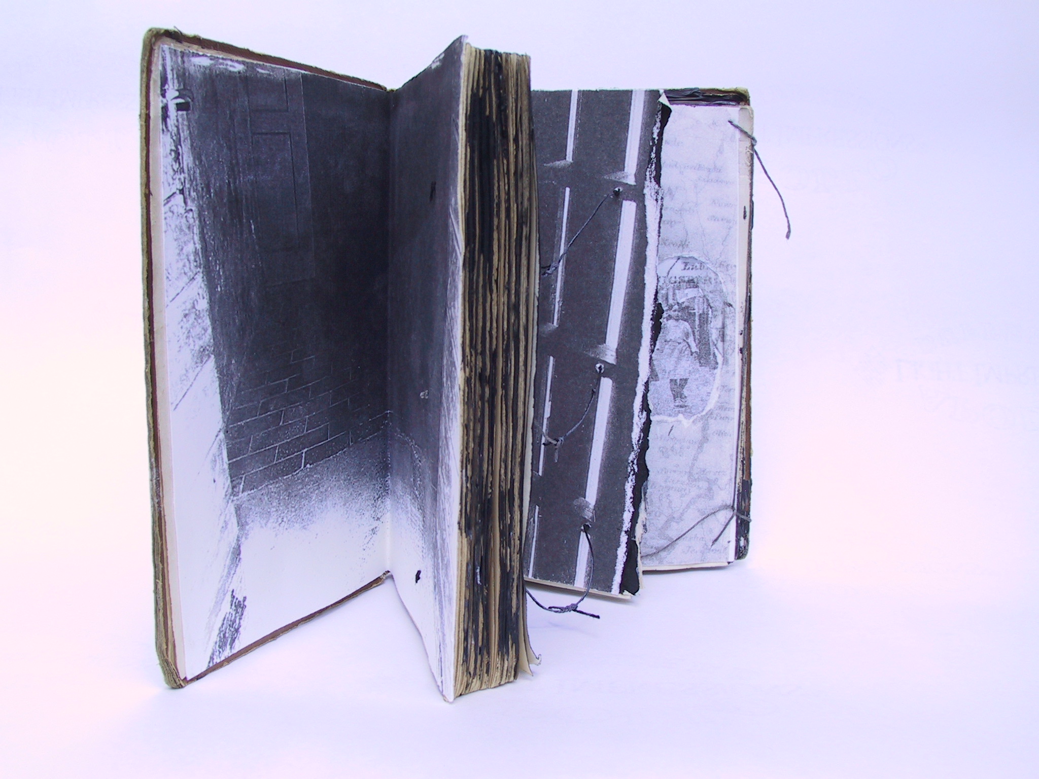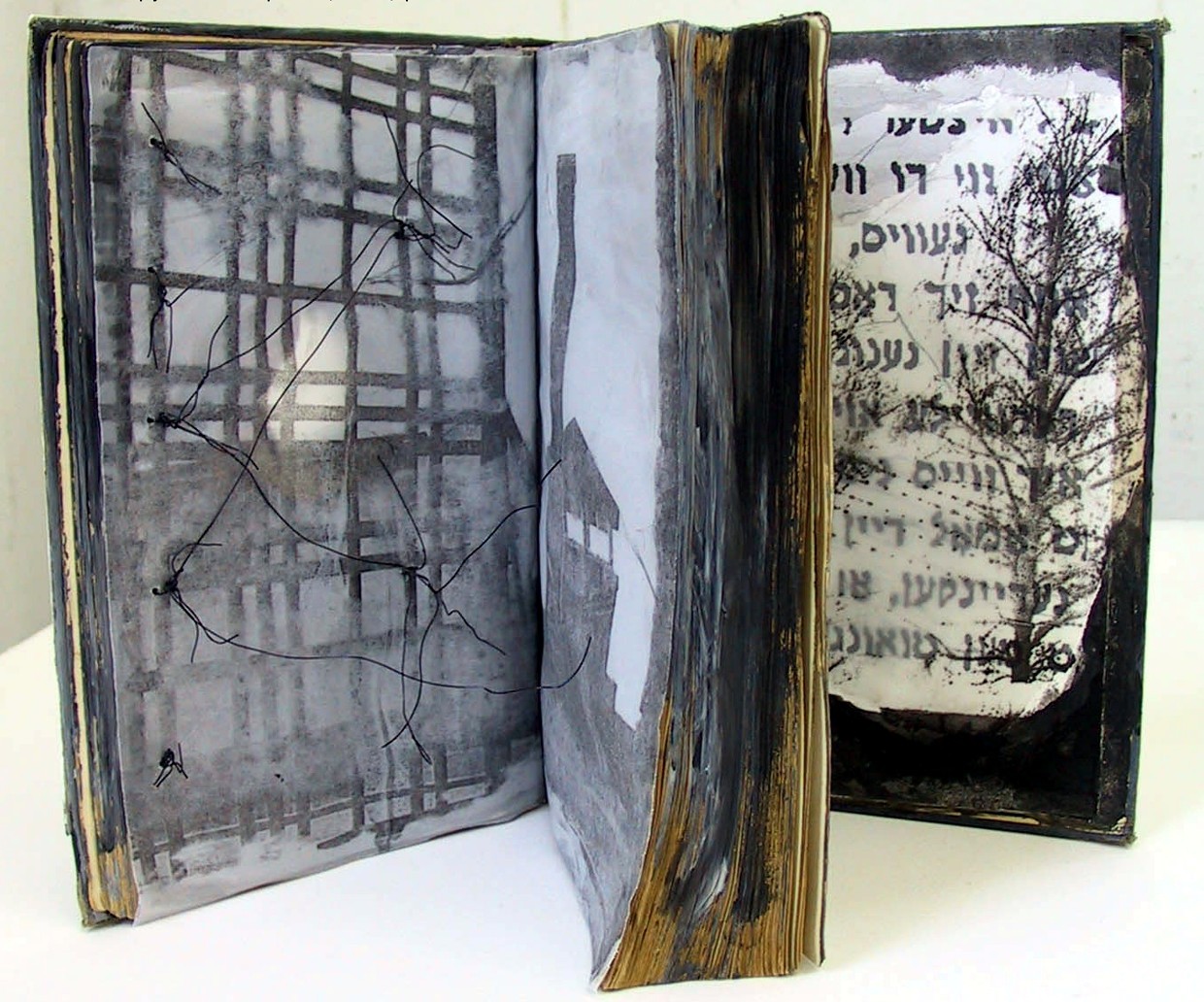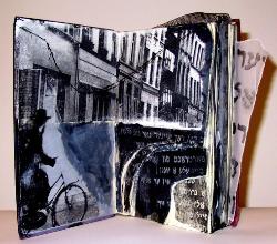 | Aileen Bassis "Holocaust Books" These books use old found books to contain images about the Holocaust. The books are distressed, pages torn, blackened and bound with thread or wire, and glued so that the story is only partly known. The books are impenetrable, the images are partially obscured. Only bits and pieces of the past can be seen and reconstructed in our minds. Want to read more about this work? Click here |